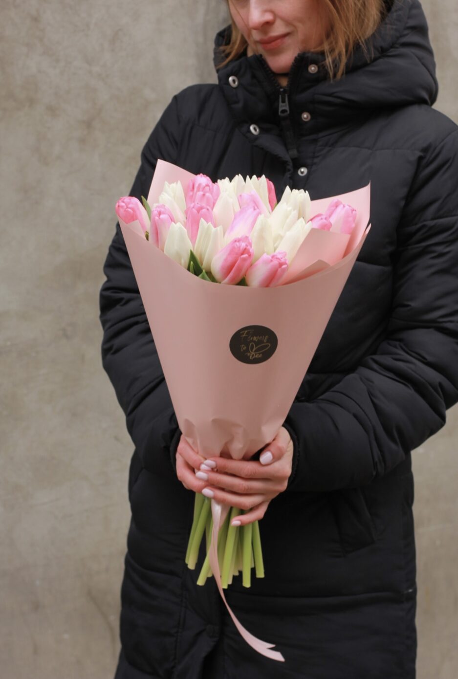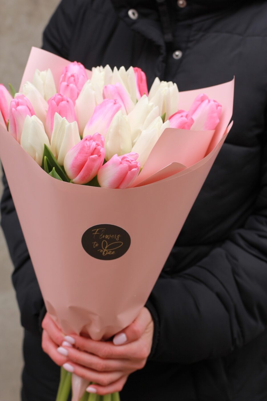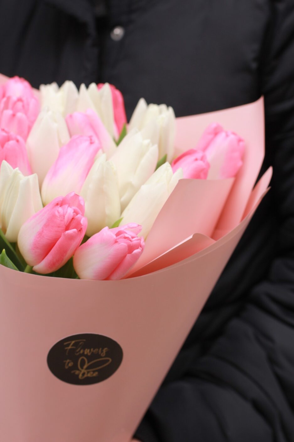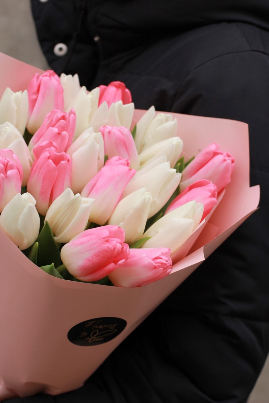 Микс из розовых и белых сортовых тюльпанов. 25 тюльпанов. Размер 27х43см.