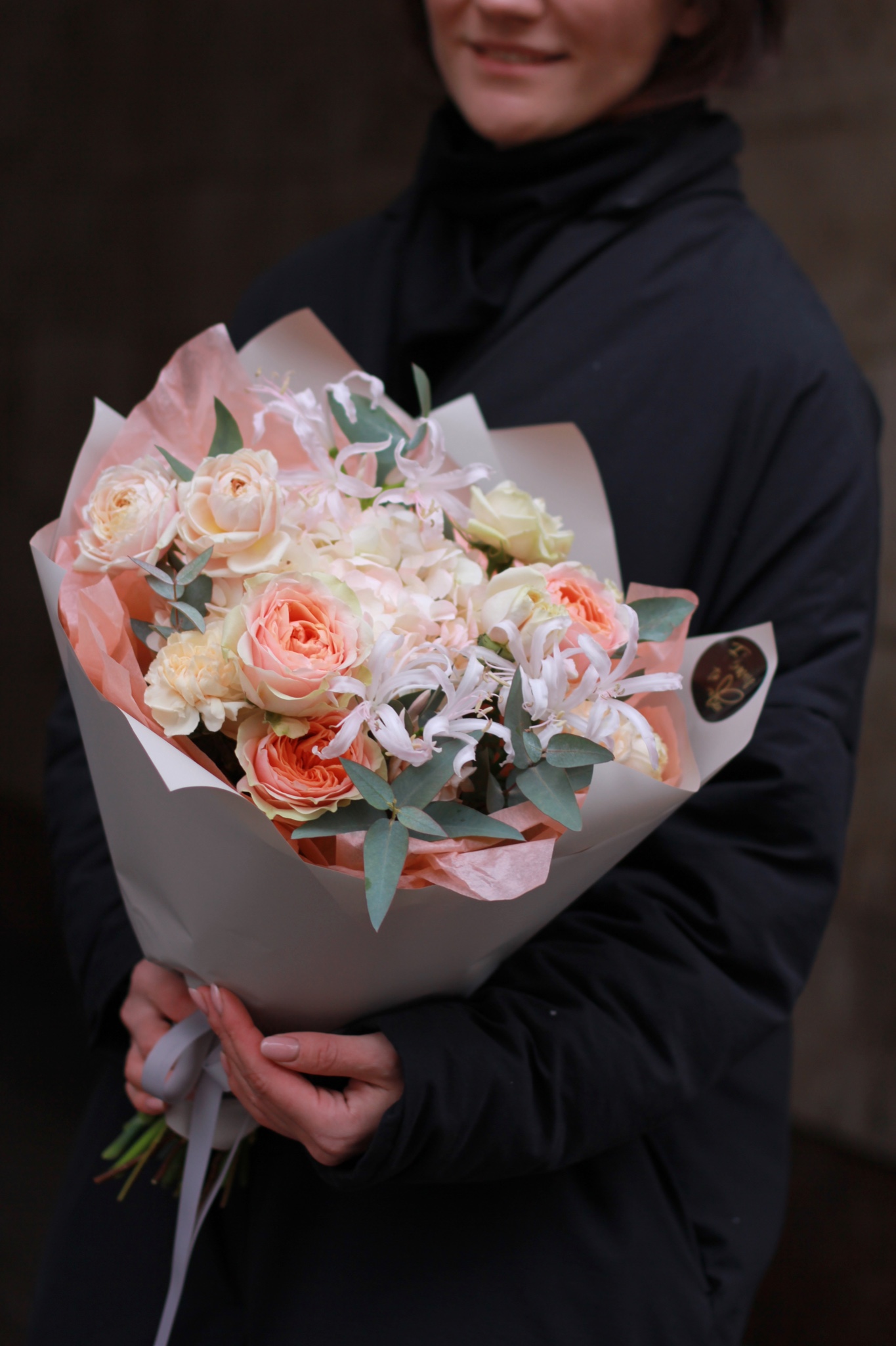 В составе: пионовидные розы, гортензия, диантусы, сортовые цветы, зелень.