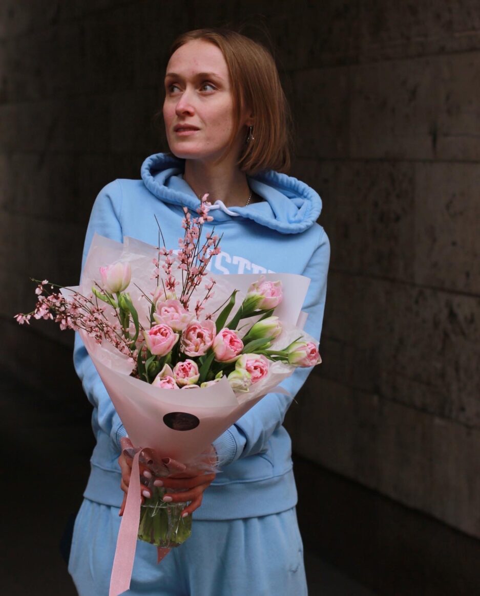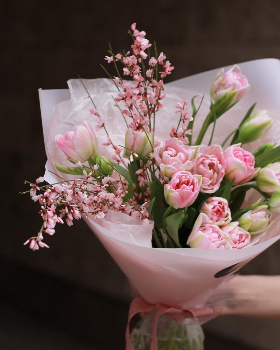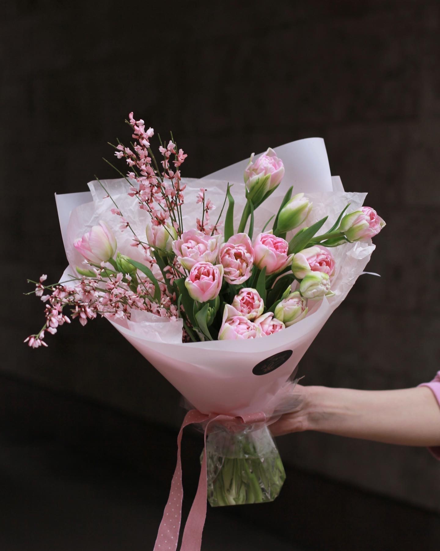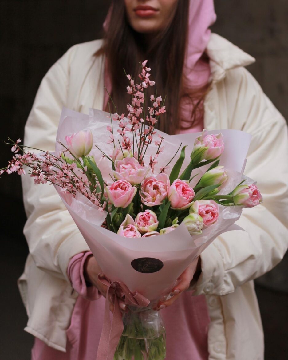Пионовидные тюльпаны с ароматной дженистой. Размер 35х45 см. Состав: 15 пионовидных тюльпанов, ветки ароматной дженисты.